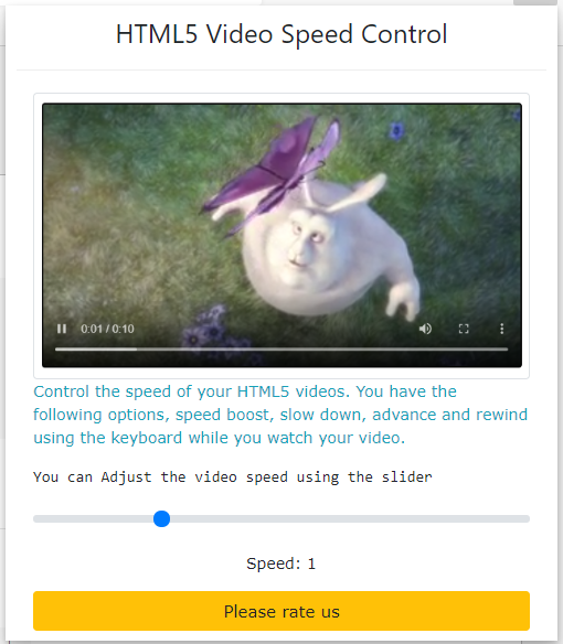 - After installing the extension. You click on the icon and can begin to speed up/slow down HTML5 videos on the current webpage.